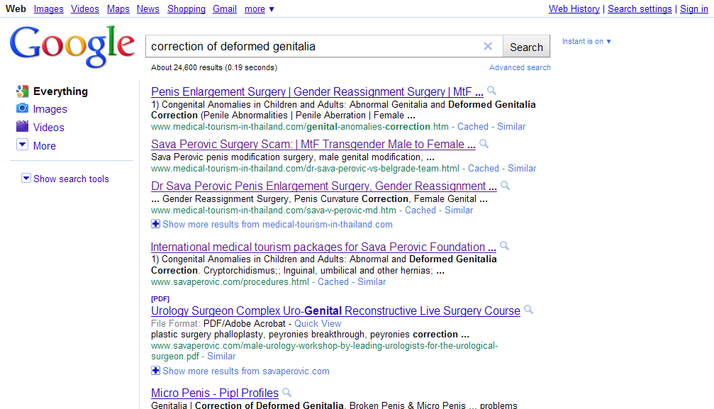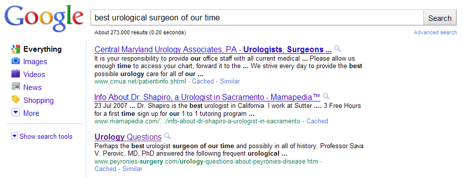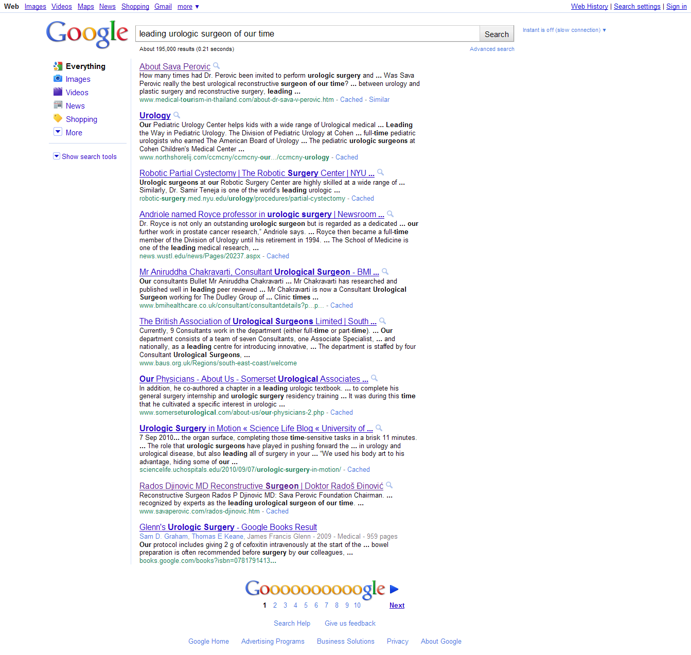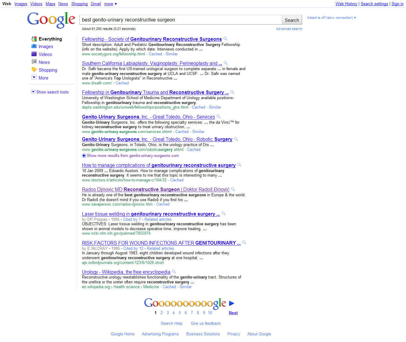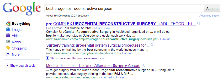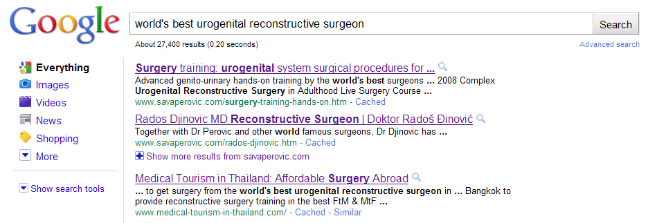 NEW 28 Nov 10 Google #1, #2 & #3 "world's best urogenital reconstructive surgeon"