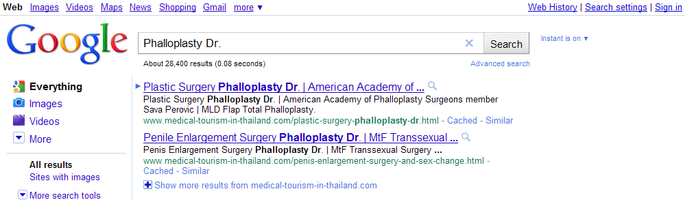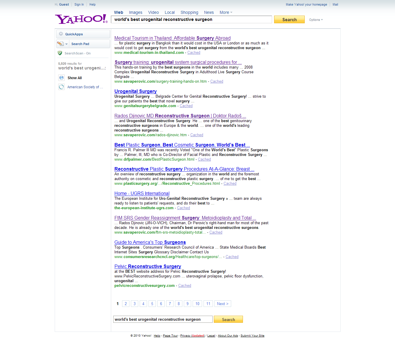 NEW 28 Nov 10 Yahoo #1, #2, #4 & #8 "world's best urogenital reconstructive surgeon"