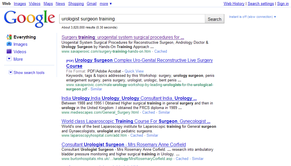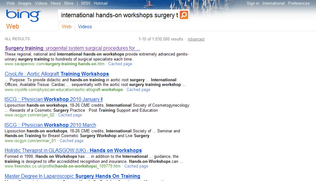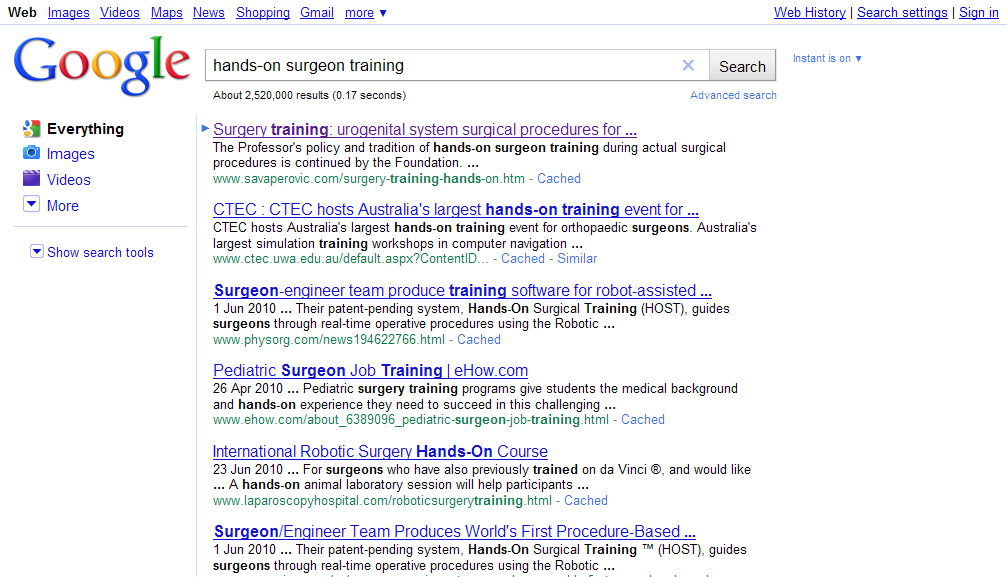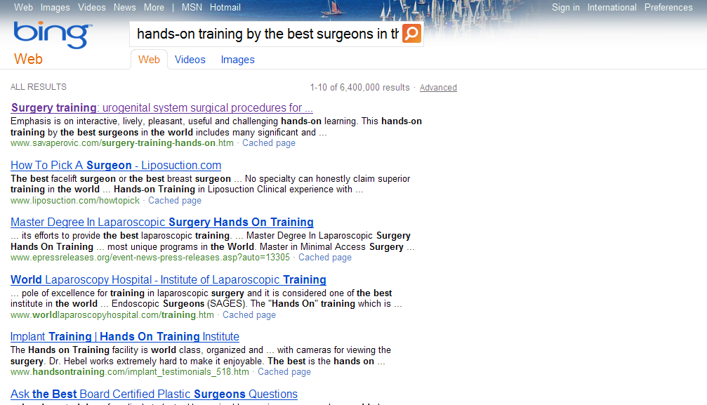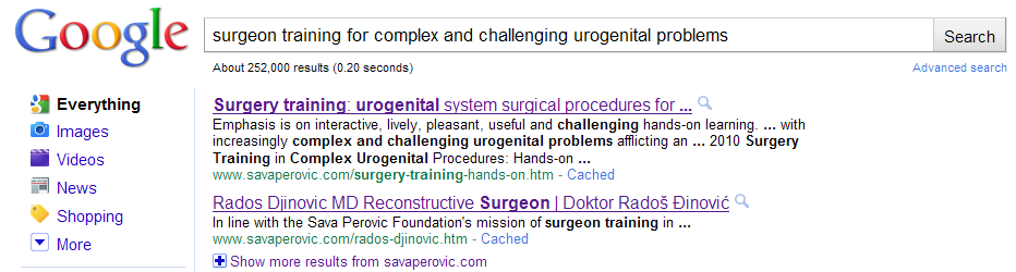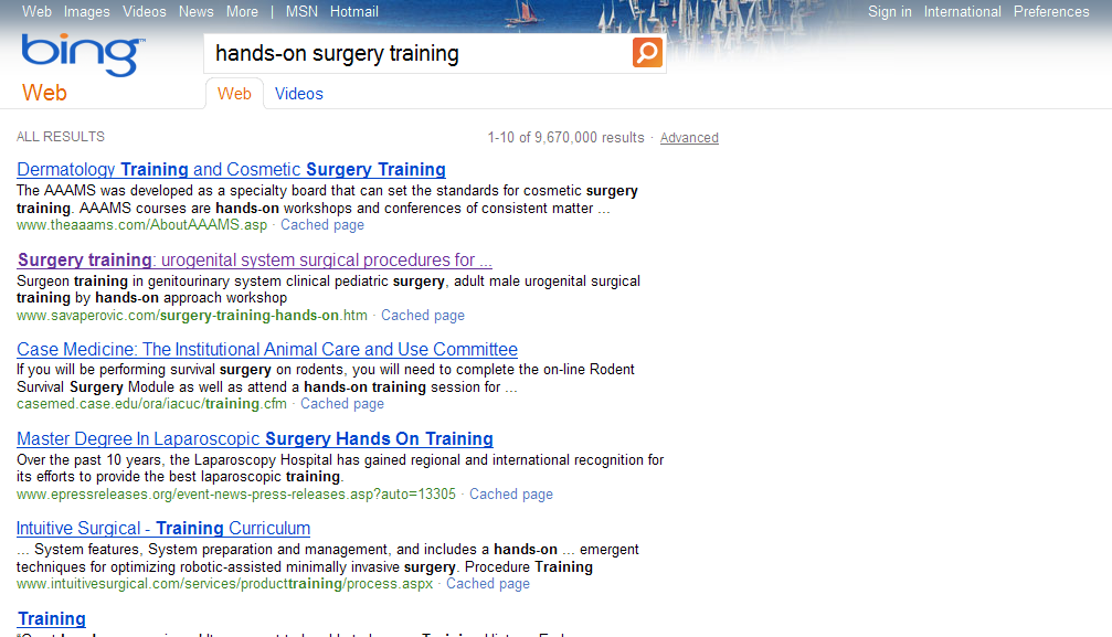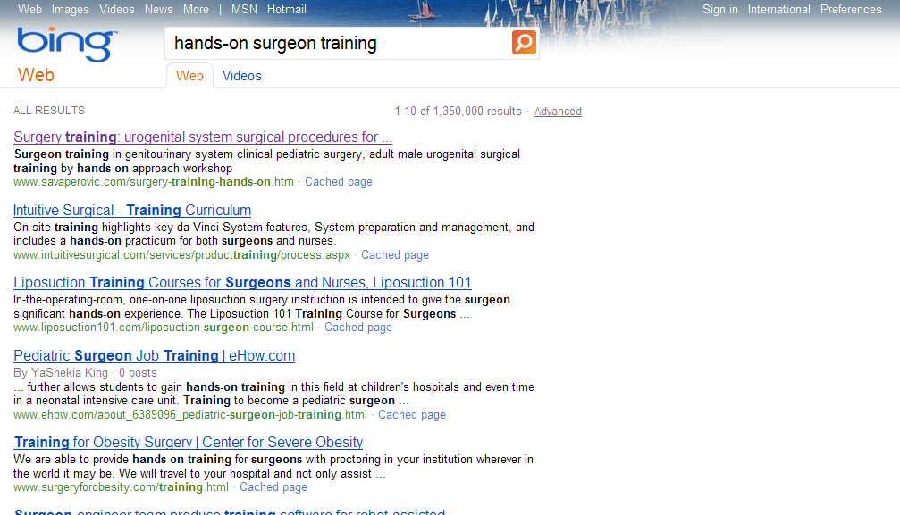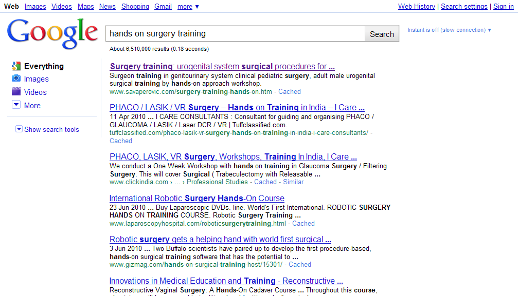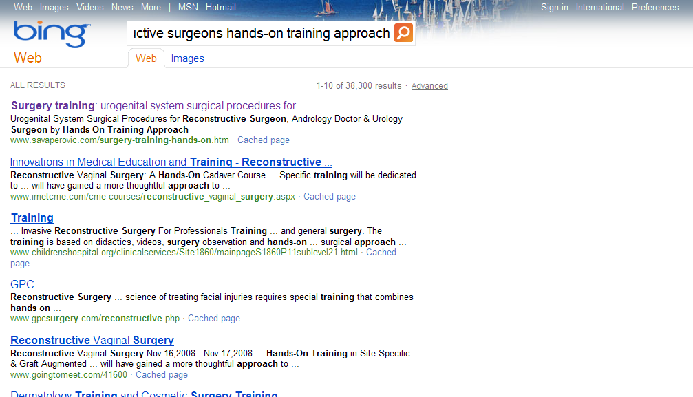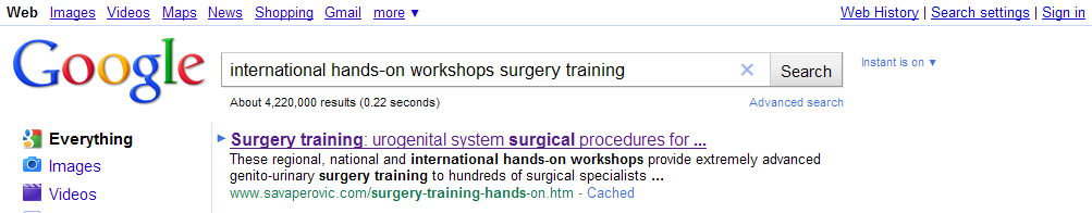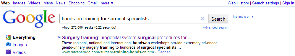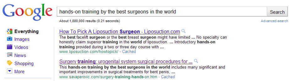 NEW 5 Nov 10 Google #1: "hands-on training by the best surgeons in the world"
