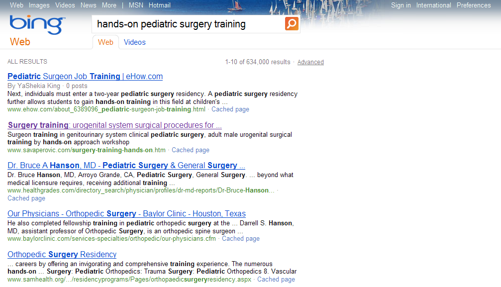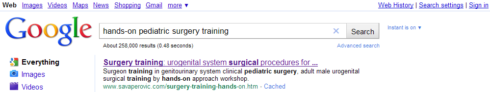 NEW 5 Nov 10 Google #1: "hands-on pediatric surgery training" [screen capture]