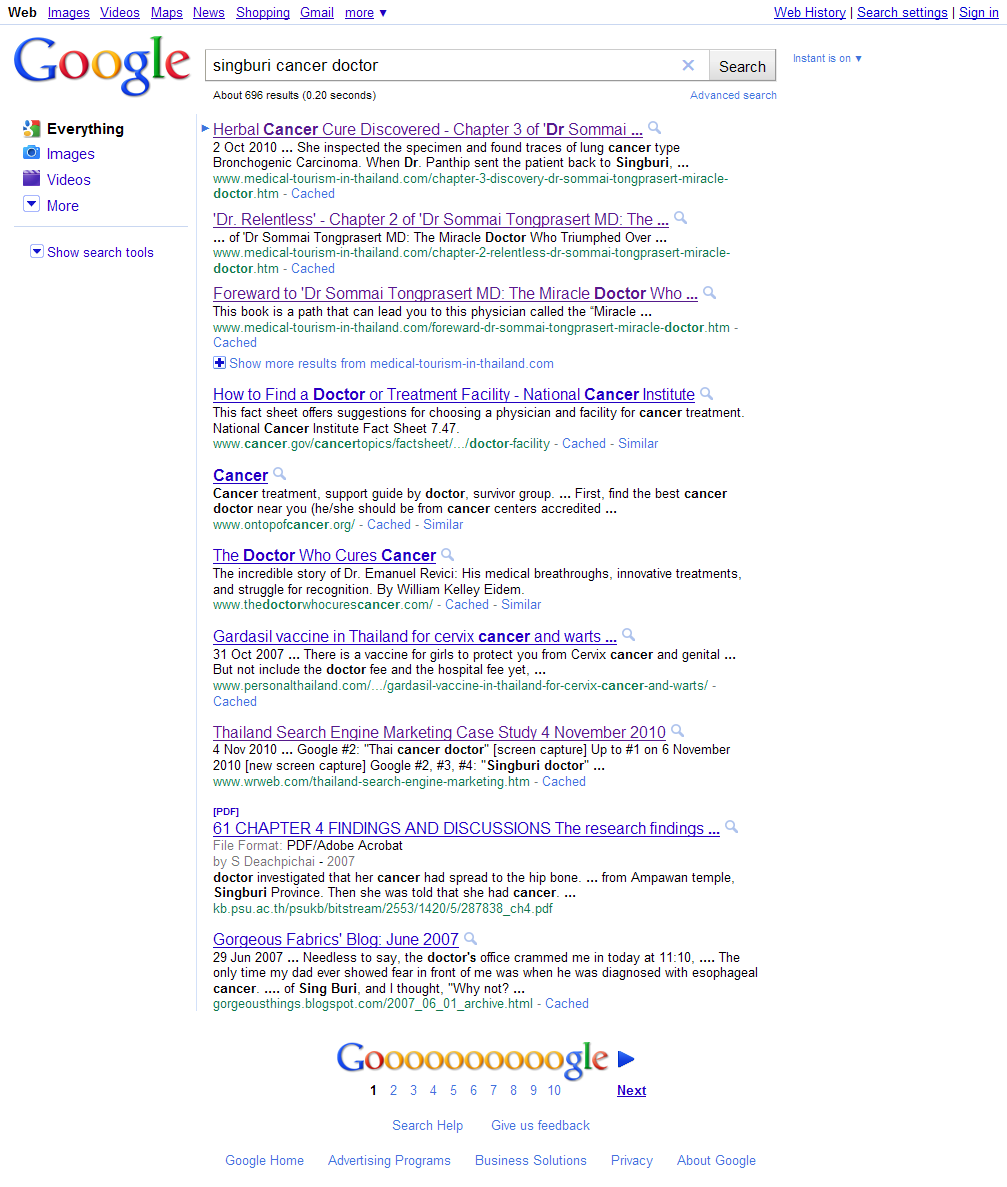 NEW 27 Nov 10 Google #1, #2, #3, #8: "Singburi cancer doctor"